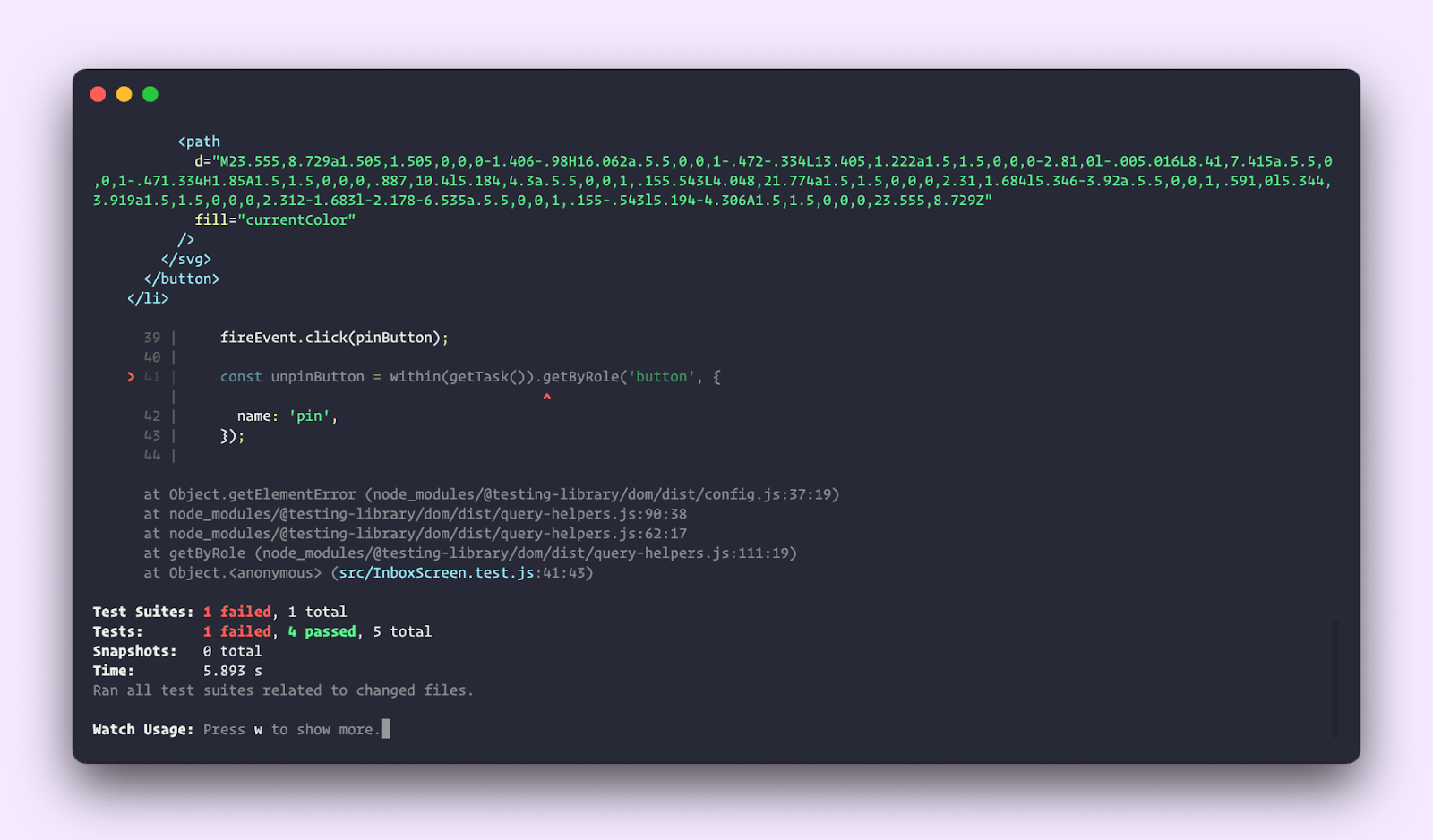If a story fails, the interactions panel highlights the broken step. You can then debug the UI right in the browser with all your favourite dev tools. Not in JSDOM using opaque CLIs. Being able to see and inspect the UI makes debugging a breeze.