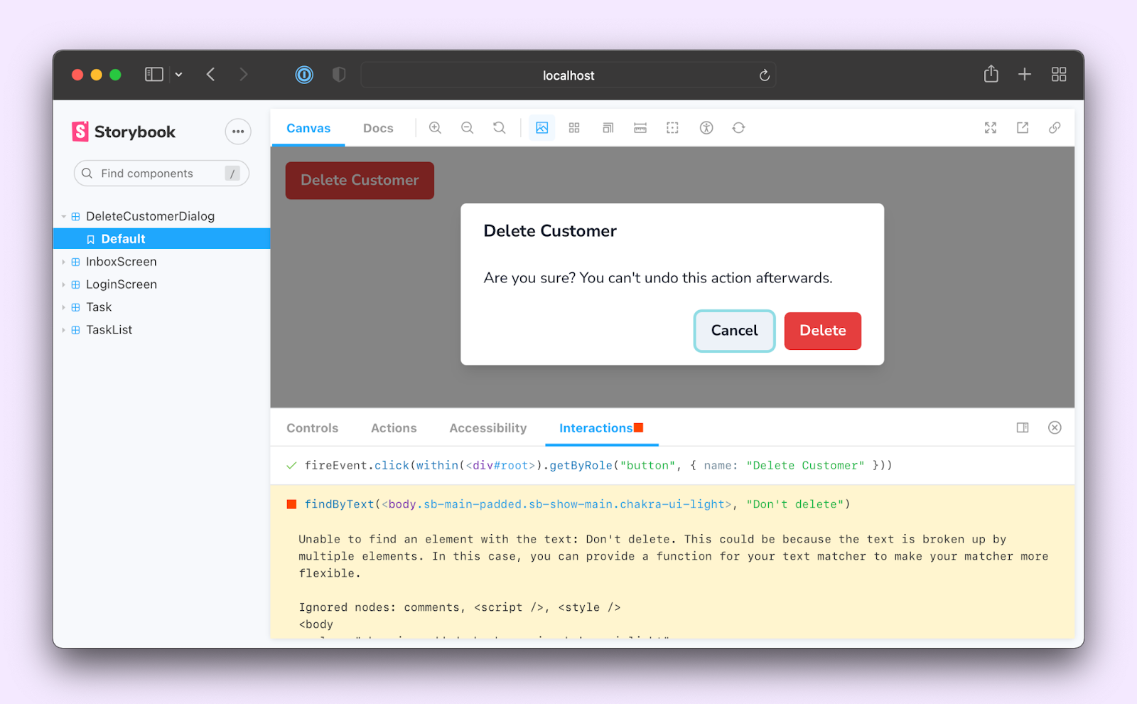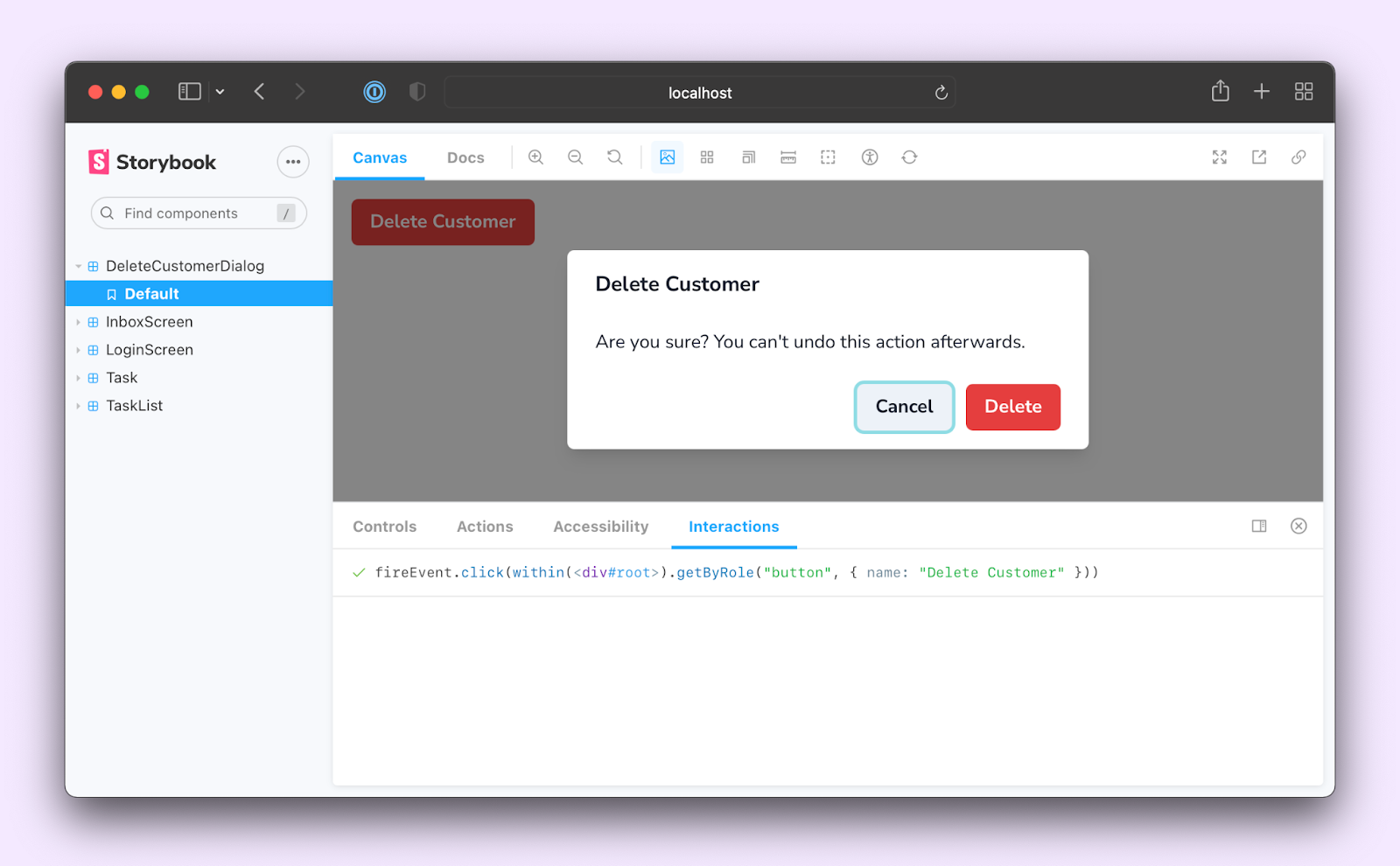 The interactions are written using a Storybook-instrumented version of Testing Library. That gives you a familiar developer-friendly syntax to interact with the DOM, but with extra telemetry to help with debugging. Here’s a basic example that demonstrates clicking a button to open a dialog box.