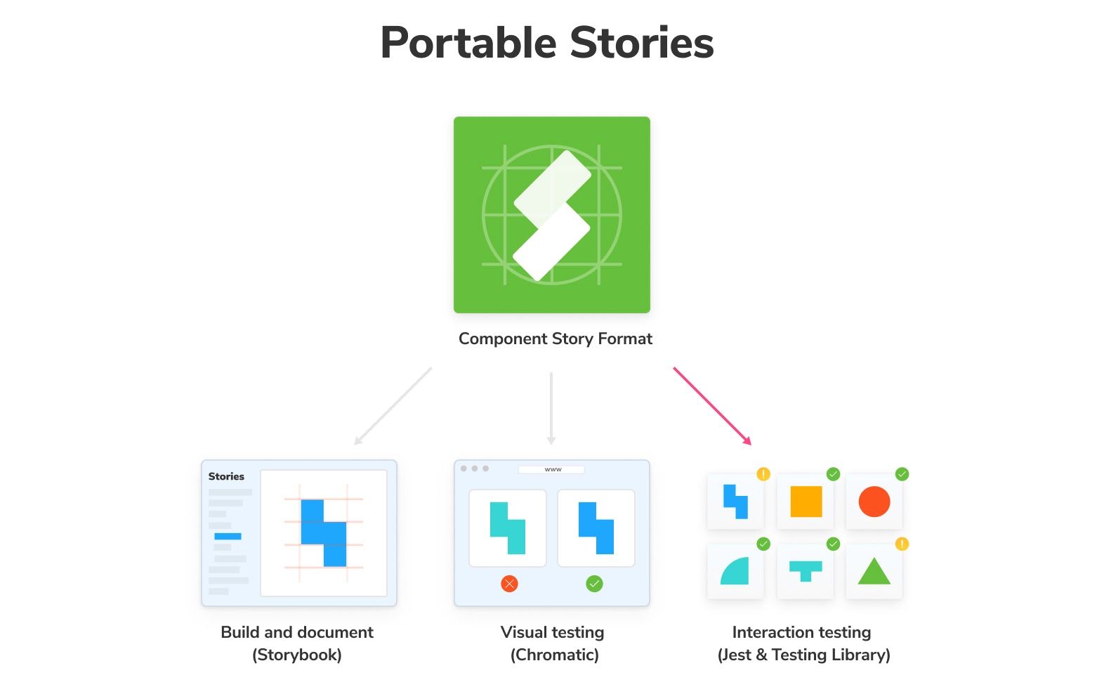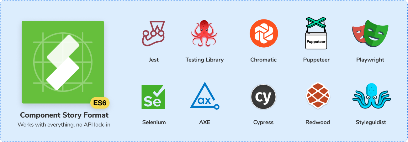 Writing test cases as stories means that you only need to do the tricky setup once: isolate components, mock their dependencies and capture their use cases. All that setup can then be imported into other testing frameworks which saves you time and headache.