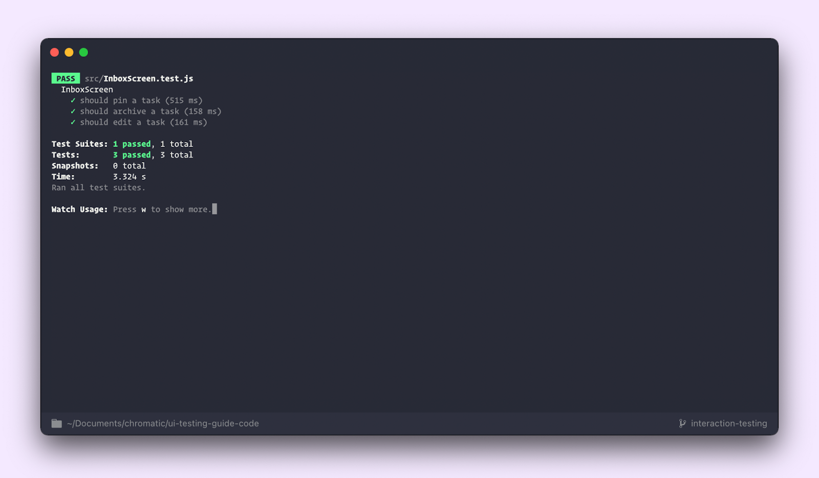 Consider the Taskbox app I introduced in a previous post. On the InboxScreen, the user can click on the star icon to pin a task. Or click on the checkbox to archive it. Visual tests ensure that the component looks right in all those states. We also need to ensure that the UI is responding to those interactions correctly.