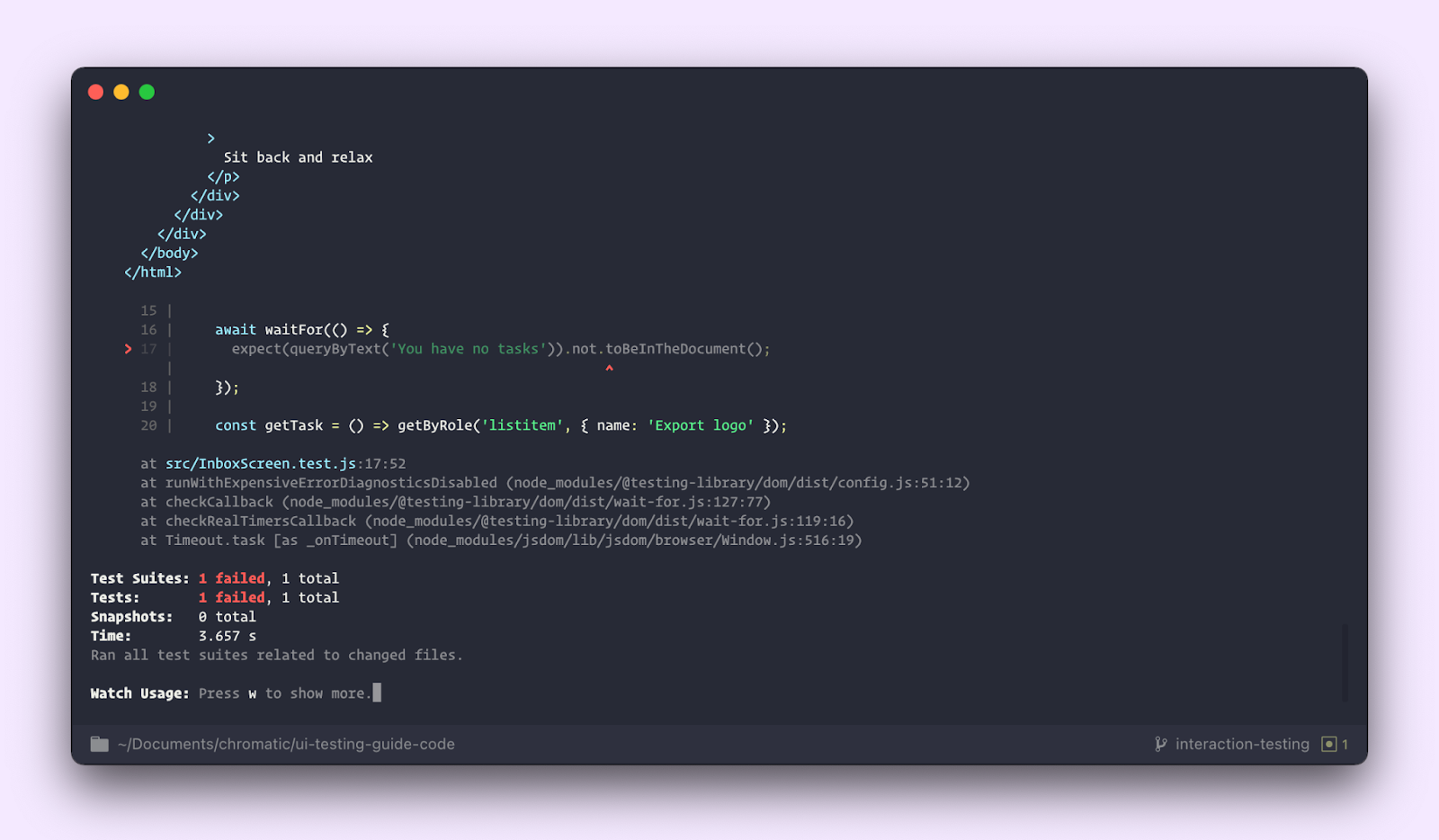 Run yarn test to start up Jest. Youโll notice that the test fails.