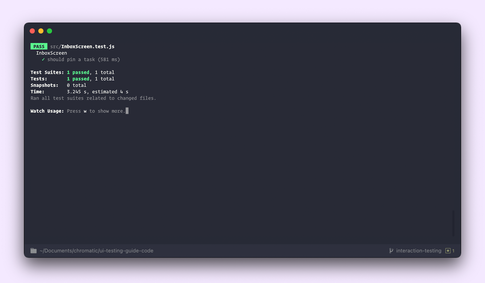 The it block describes our test. We start by rendering the component, waiting for it to fetch data, finding a particular task, and clicking the pin button. The assertion checks to see if the pinned state has been updated. Finally, the afterEach block cleans up by un-mounting React trees mounted during the test.